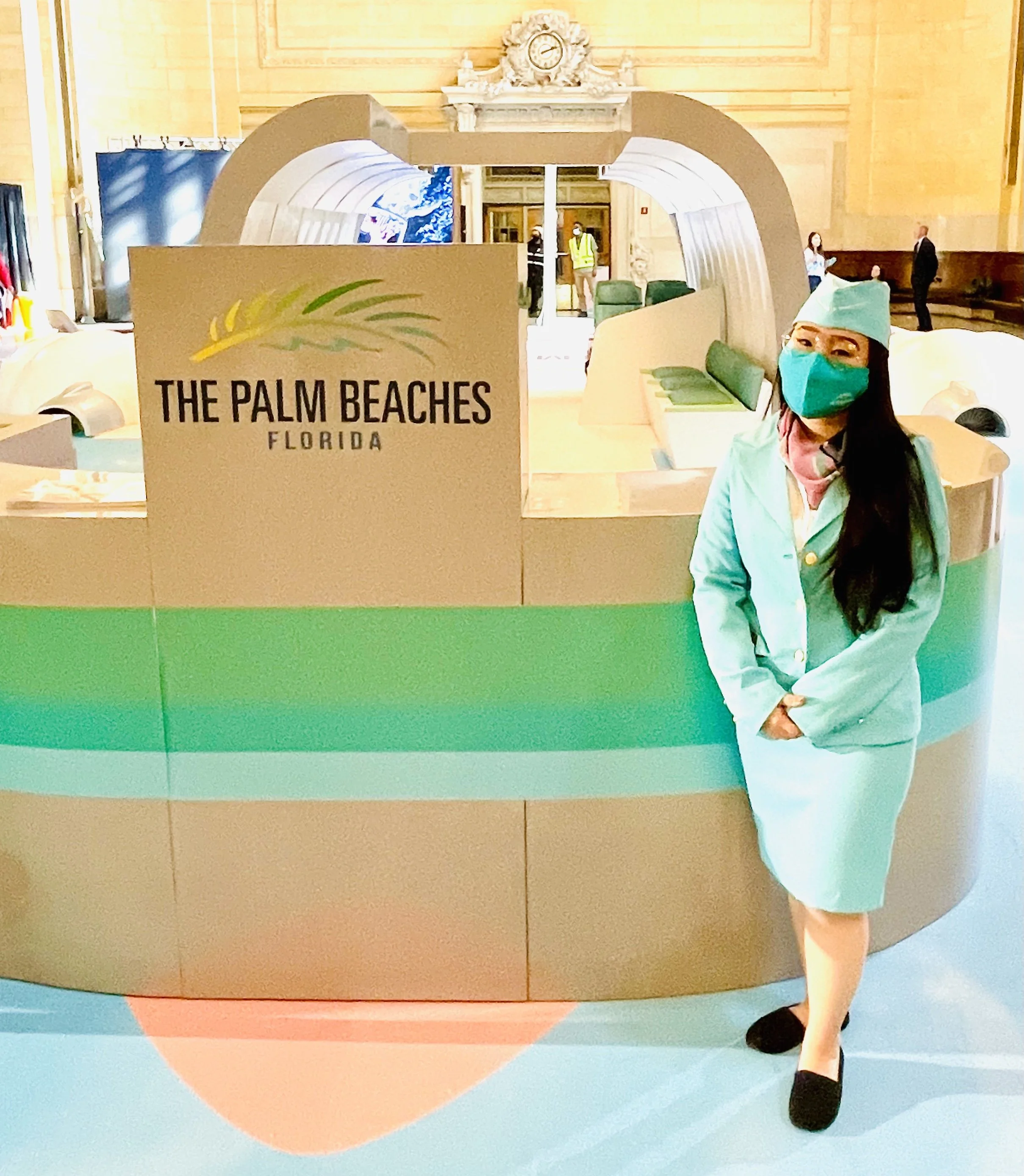 Visitors were instructed to enter a giveaway by taking a selfie in the colorful space and tagging affiliated partners for a chance to win two roundtrip tickets to beaches IRL. The faux flight attendants mingled about the grand space handing out “trip inspiration guides” and exclaiming to visitors, “there are now 25 daily direct flights from JFK to the Palm Beaches”.